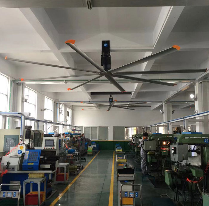 我公司生產的大型工業吊扇直接懸掛在廠房屋梁下,風力柔和,能加快車間空氣流通,有效降低車間內溫度,改善車間空氣環境質量,有利于員工的身體健康。